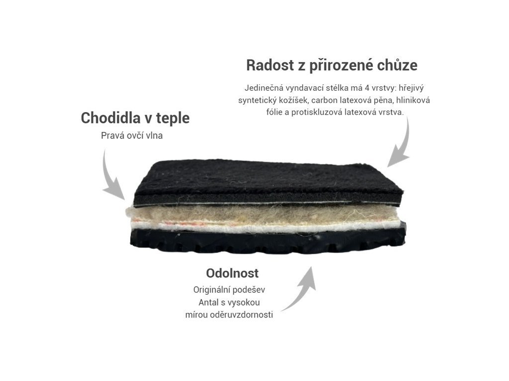 Stélka: kombinace ovčí vlny, aluminiové fólie, vrstvy latexu a hřejivého chloupku pro maximální komfort chodidel