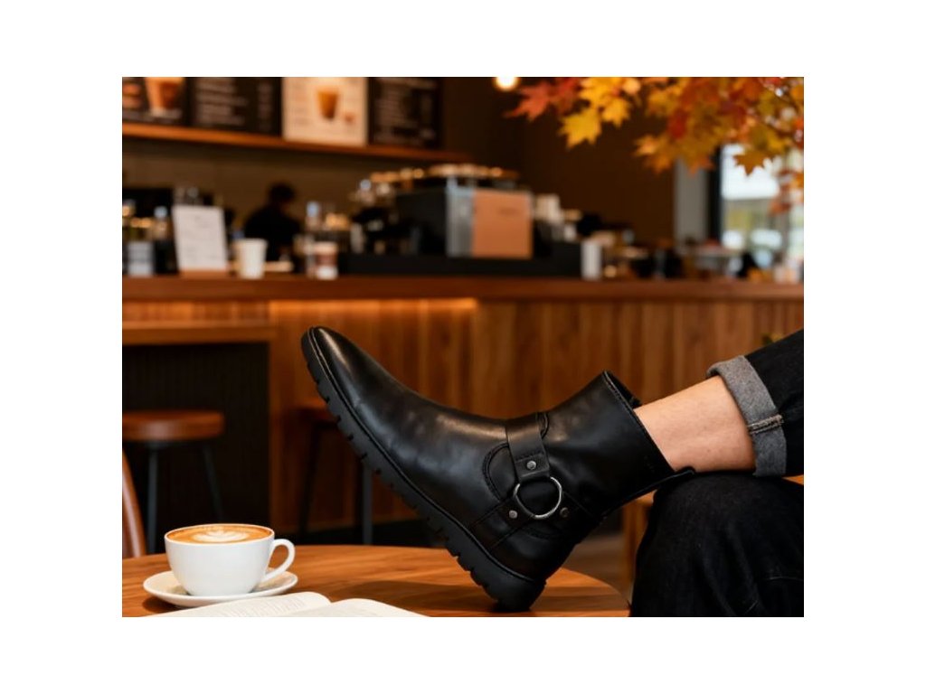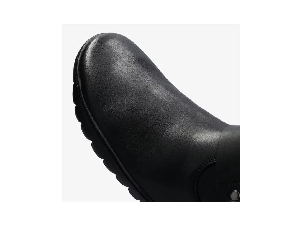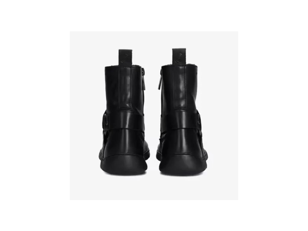 - Výrazné biker boty s koženými pásky, kovovým kroužkem a zipem pro snadné obouvání i zouvání