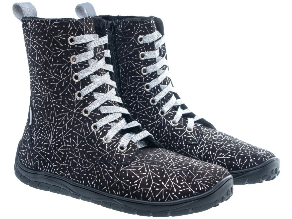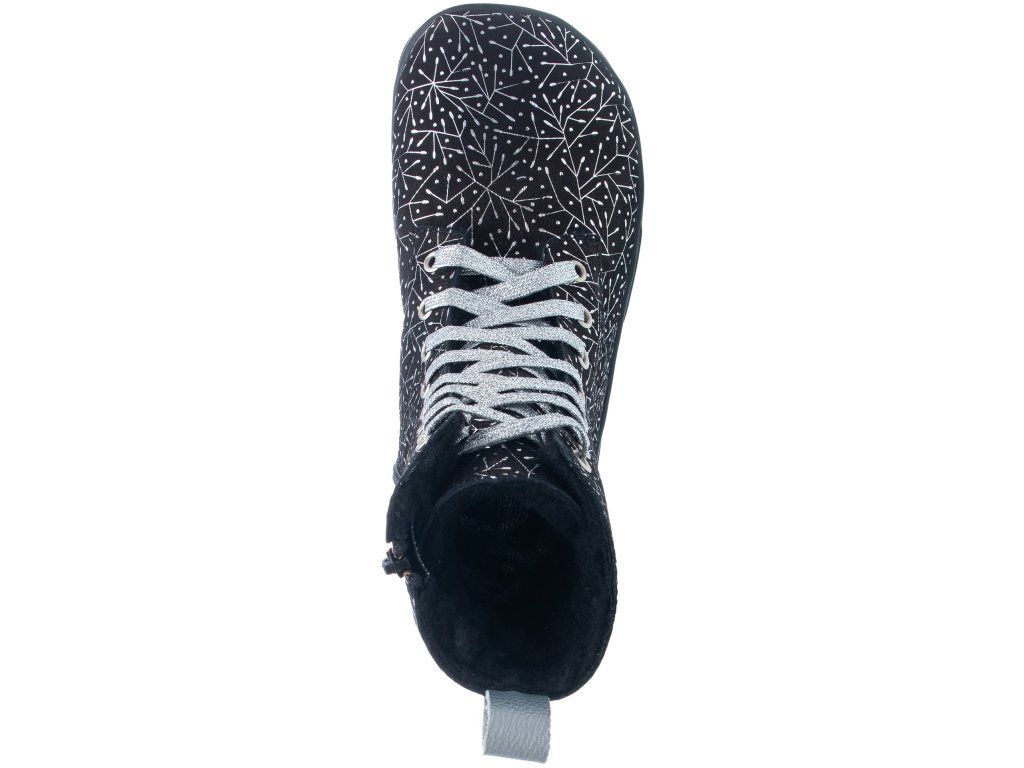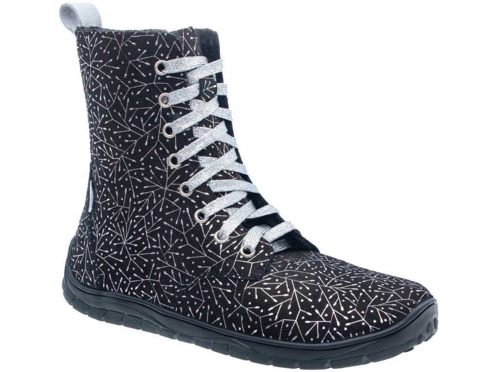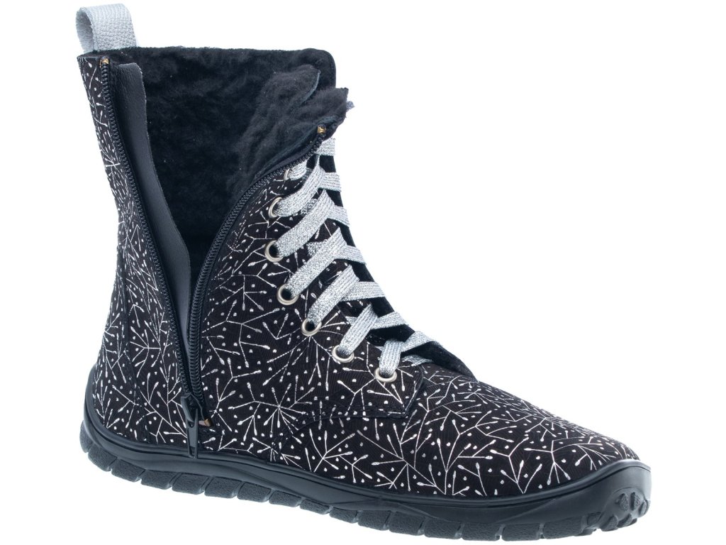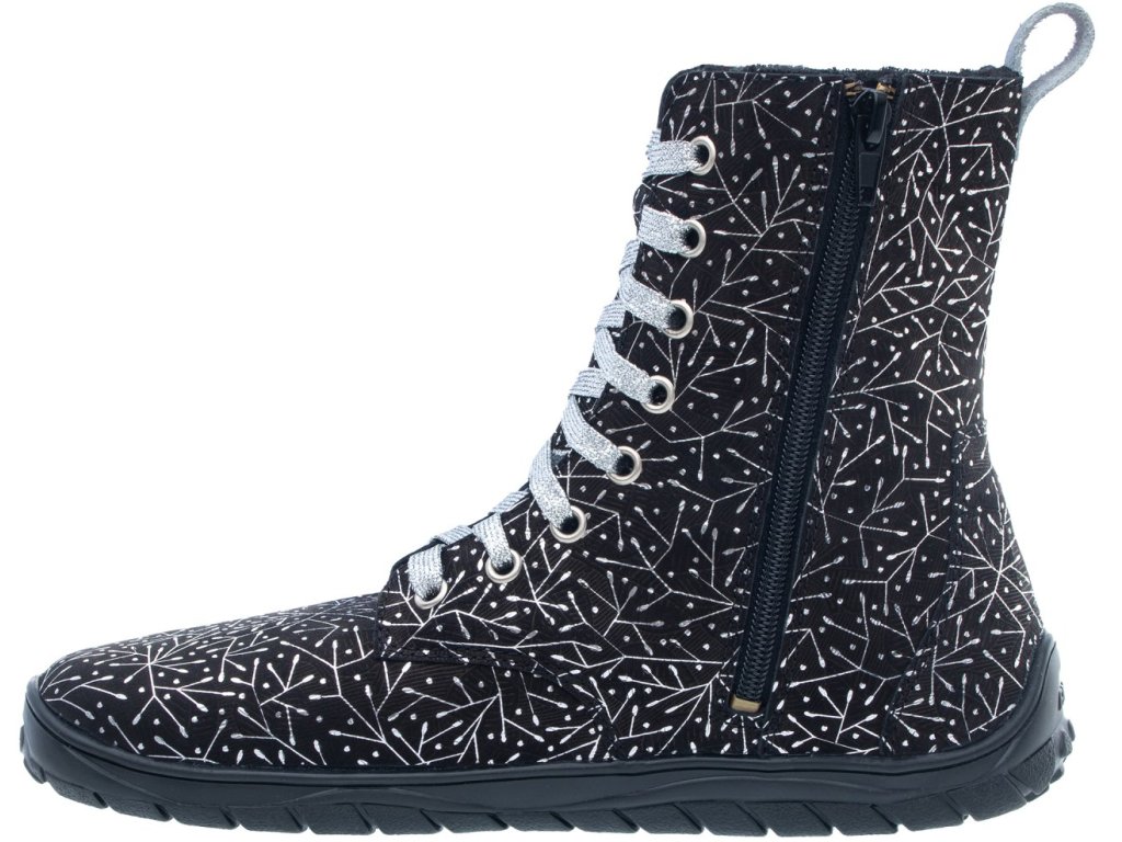 Zimní vysoké kožené barefoot boty na šněrování a zip v jedinečné kombinaci černé hladké kůže s listovým vzorkem a stříbrným potiskem doladěné stříbrnými tkaničkami. V tomto modelu Freya budeš mít nejen pohodlí, ale také zazáříš, kamkoliv vkročíš!