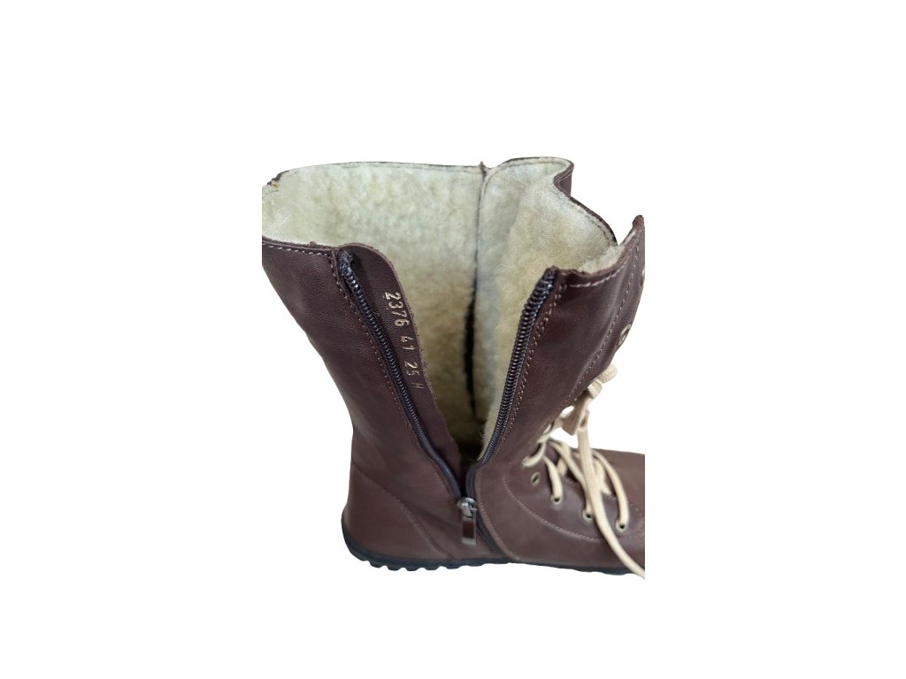 Nízké šněrovací kožené barefoot kozačky HIRA v tmavě hnědé barvě, které se přizpůsobí téměř každému lýtku